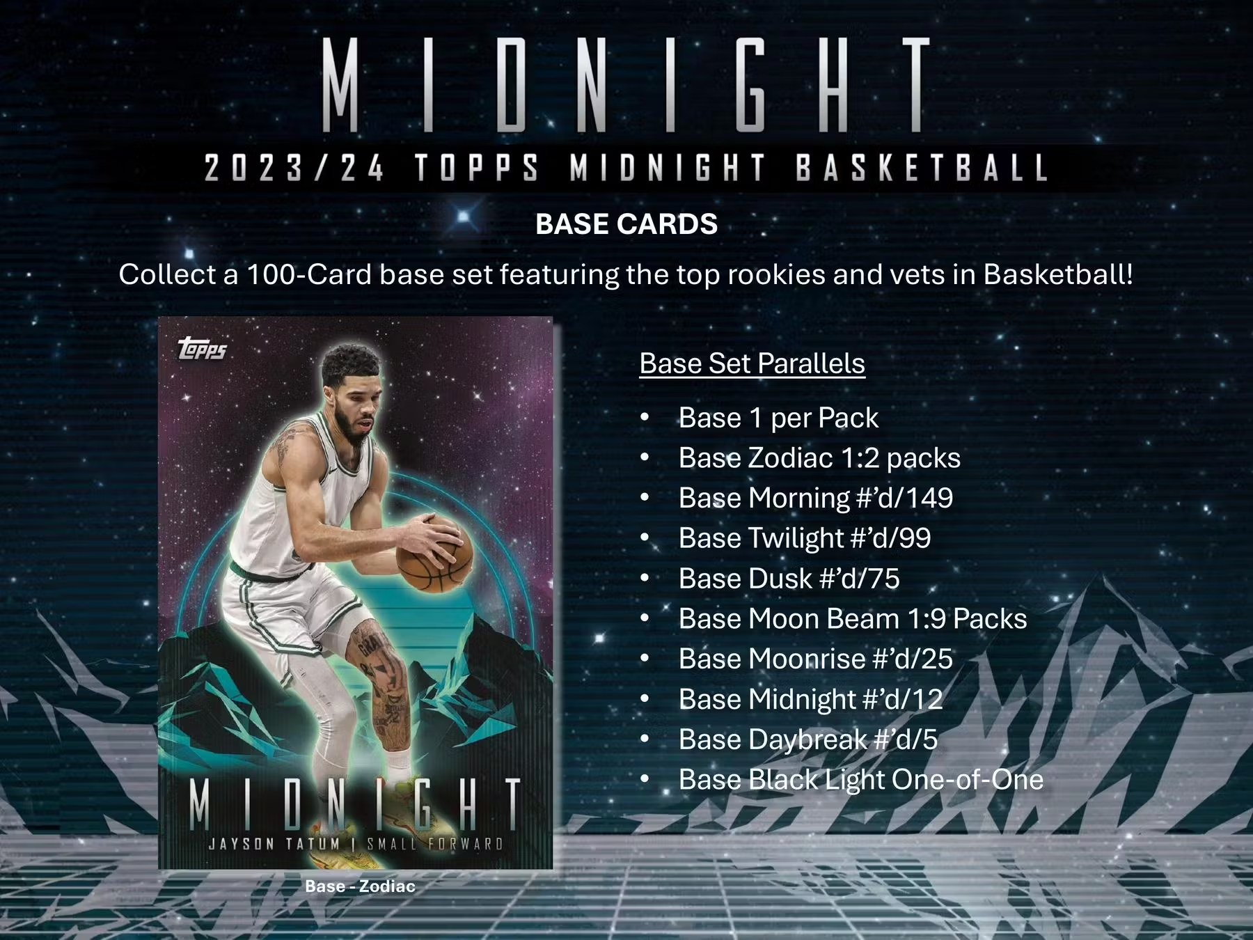 Collectors will be counting down to Midnight Basketball! Brand new in 2024, Topps Midnight will deliver a 100-card base set of some of the biggest names in Basketball. Find Autographs of the top rookies, vets and retired greats along with Rookie Jersey Autographs of the top rookies in the 2023 Draft.