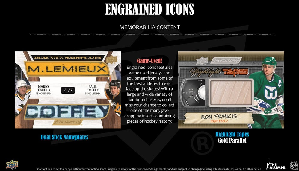 Engrained Icons Hockey is here in a big way!! This product features nothing but the best stars that have graced the NHL! Filled with retired superstars, collect the 100-card base set that will bring nostalgia to collectors with each box opened! Keep an eye out for hard-signed autographs and game-worn & game-used memorabilia, including a wide variety of stick memorabilia!