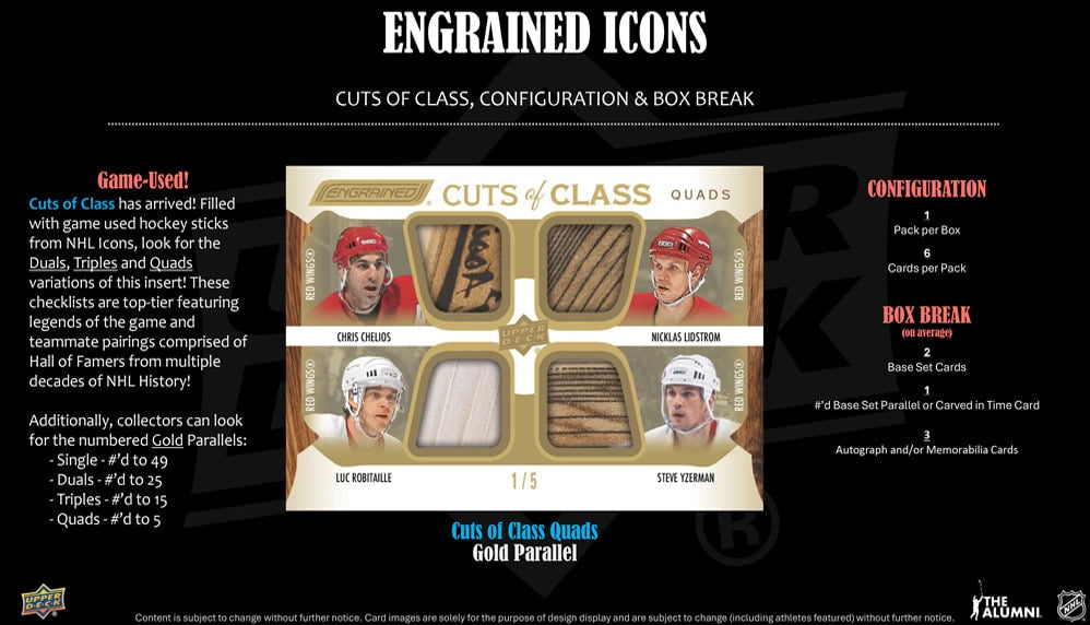 Each 2024-25 Upper Deck Engrained Icons Hockey Hobby Box contains 1 pack with 6 cards in every pack!