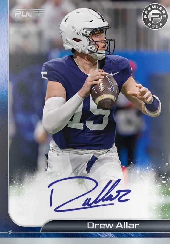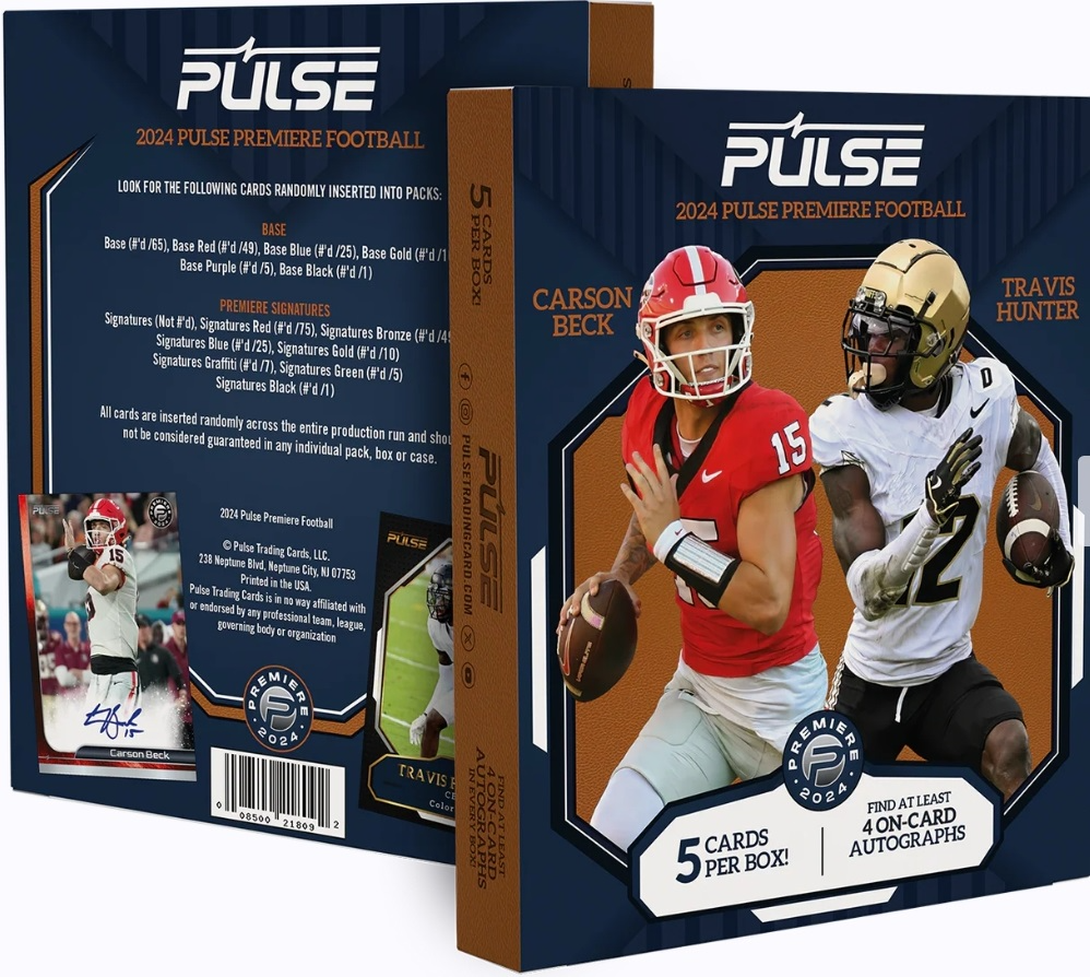 The 2024 Pulse Premiere Football series delivers elite college talent in a compact, high-impact format. Each box includes 5 premium cards, featuring 4 on-card autographs—with at least one rookie auto numbered to 75 or less—and 1 base or parallel numbered to 65 or less. Every card is sealed in a jewel case for maximum protection and display.