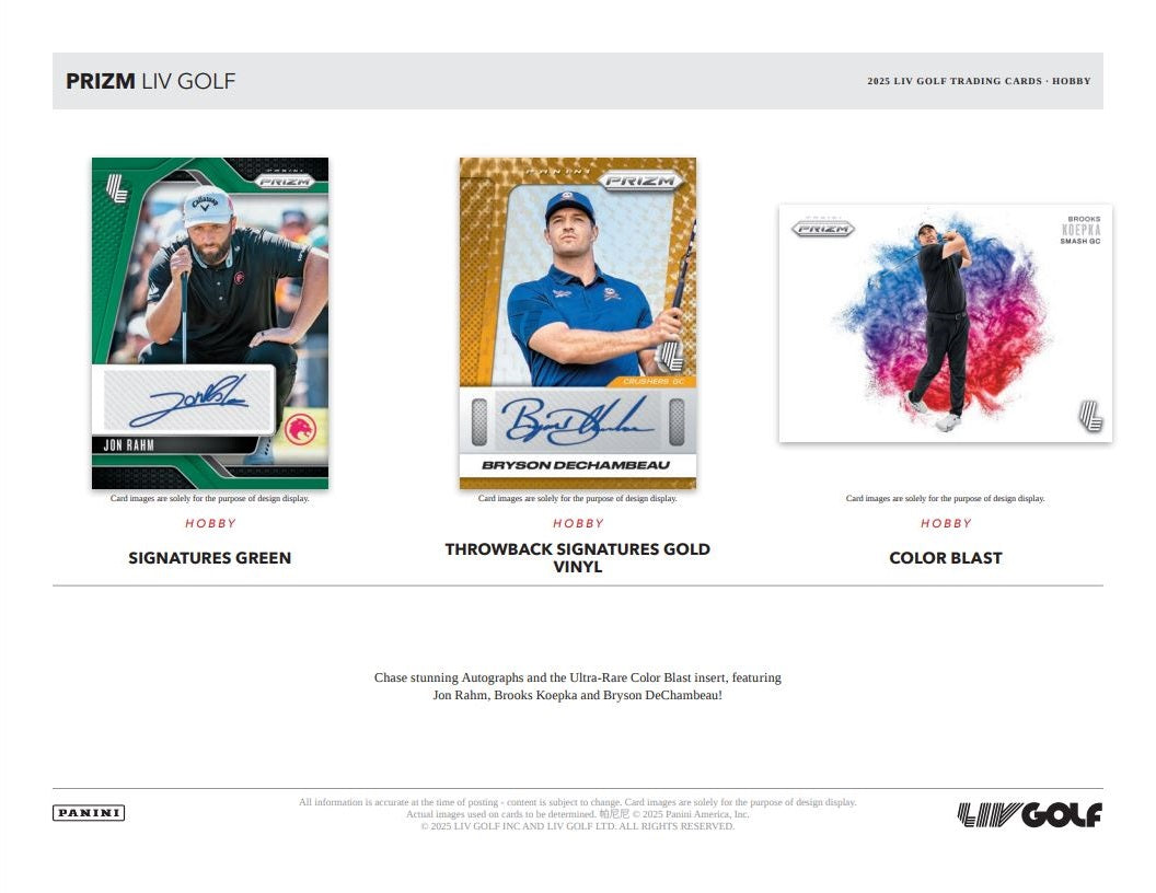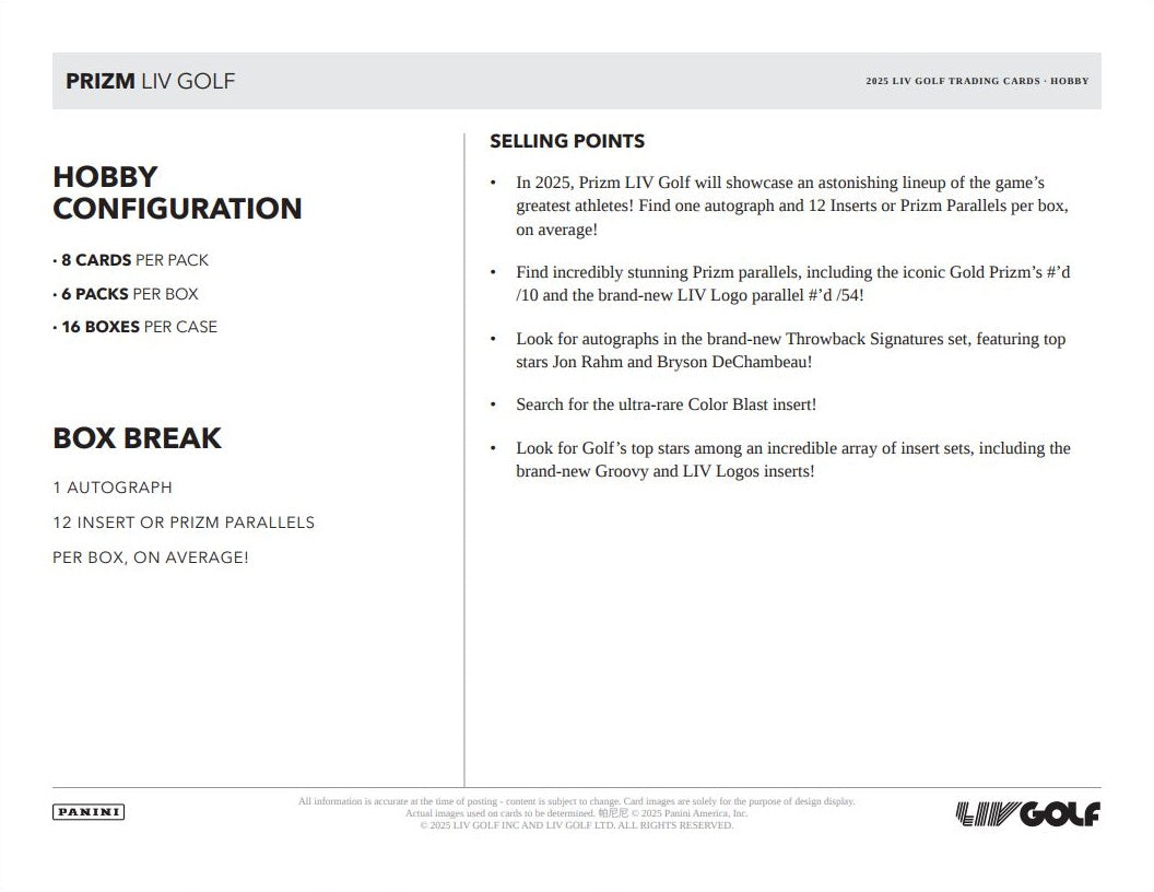In 2025, Prizm LIV Golf will showcase an astonishing lineup of the game's greatest athletes! Find one autograph and 12 Inserts or Prizm Parallels per box, on average!