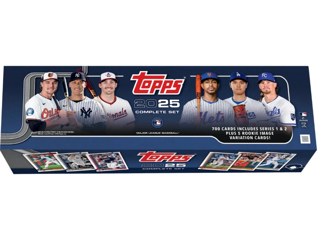 The 2025 Topps Complete Sets Baseball – Retail Edition offers the full 2025 base set in a single package. It contains all 700 cards from Series 1 and Series 2, ensuring you get every base card, including MLB’s biggest stars and the year’s top rookies. Exclusive short print rookie cards also add extra value to the set.