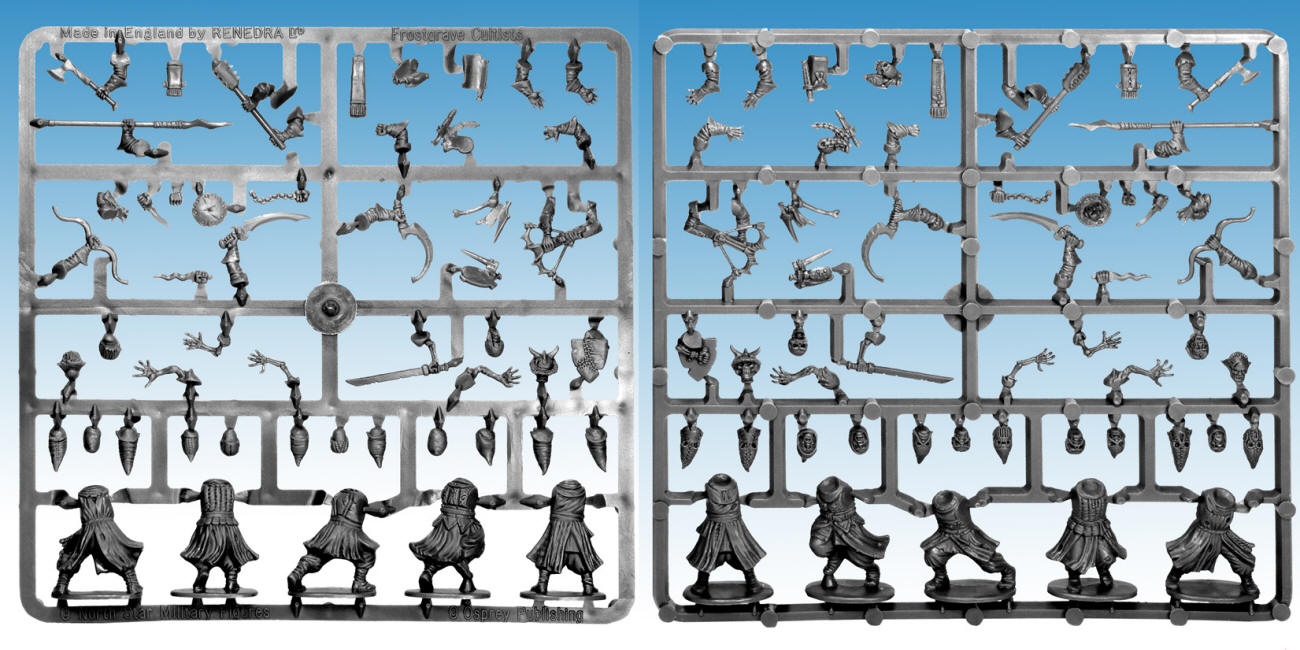 The Cultists have been designed to compliment the Frostgrave Soldiers plastic box set. By that we mean the arms, heads and equipment are interchangeable, giving you even MORE choice to built a unique and personal Warband.