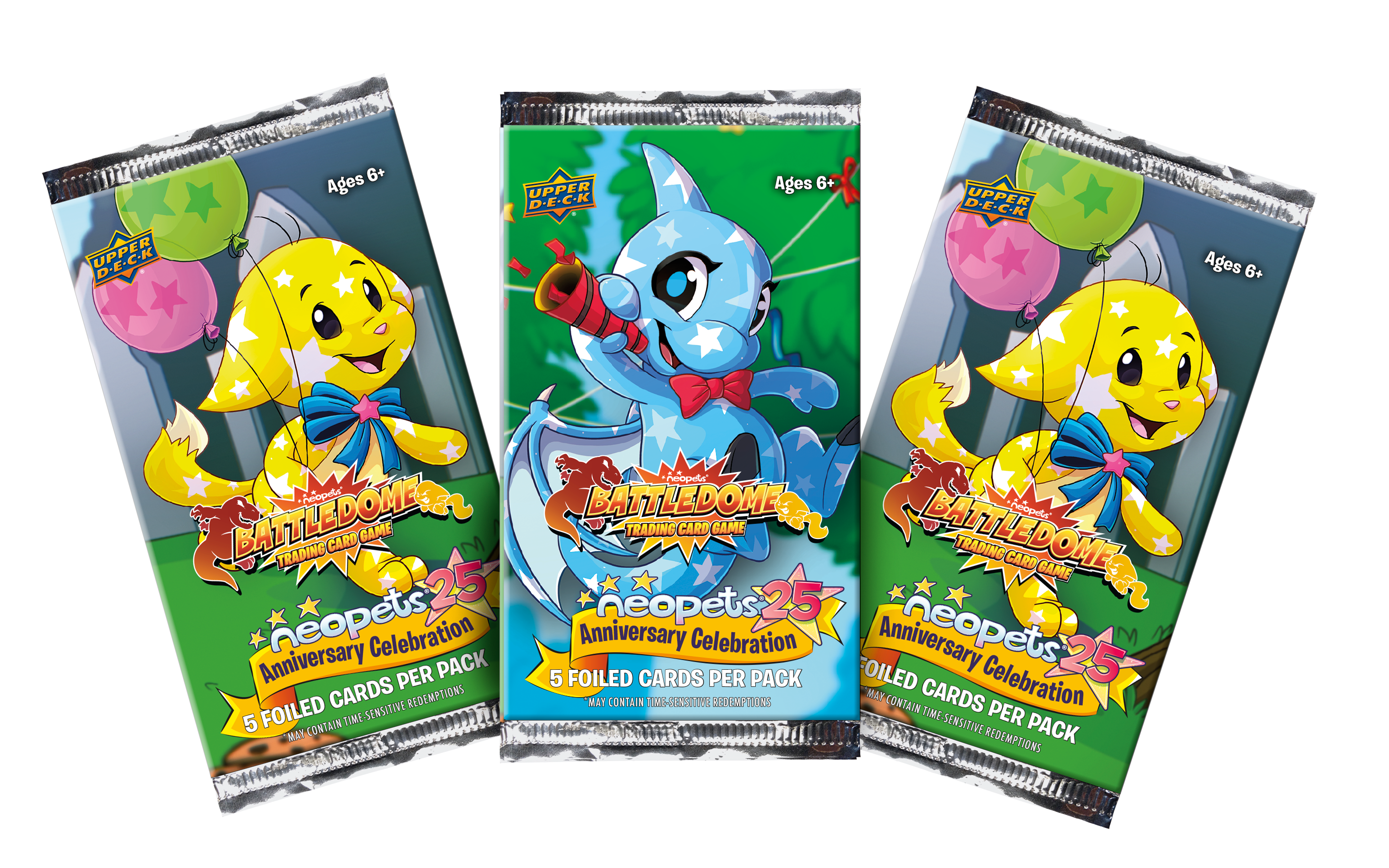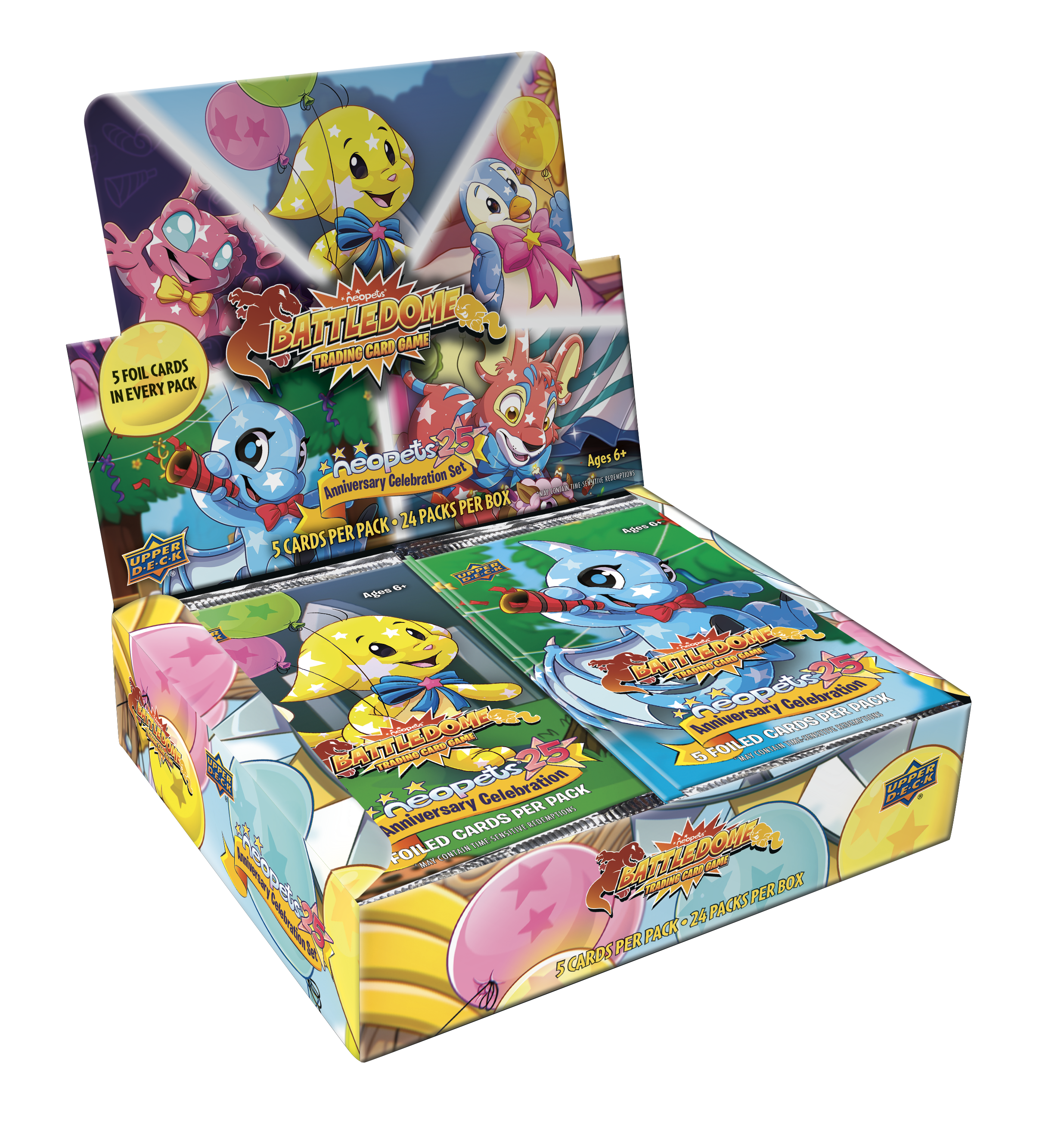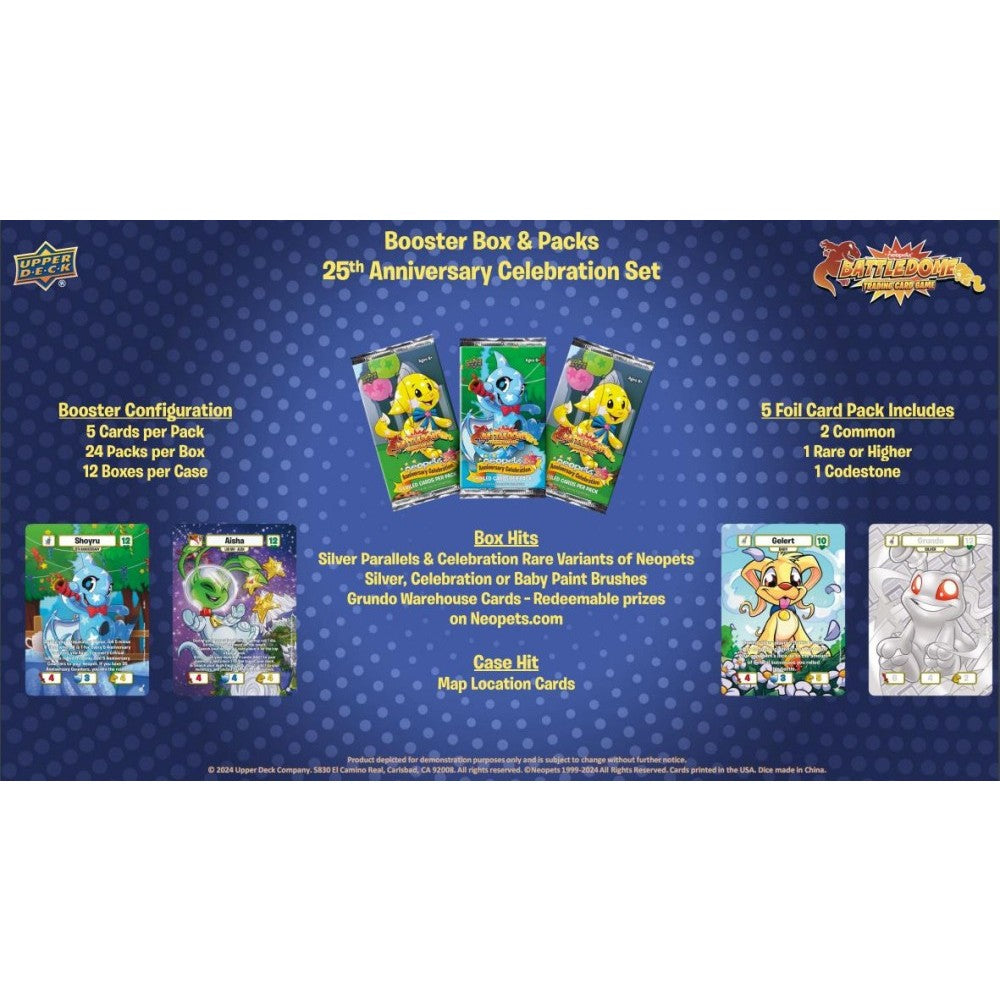 It’s time to party! In celebration of the 25th Anniversary of Neopets, the Neopets Battledome Trading Card Game 25th Anniversary Set introduces new variants of the iconic Neopets and card types to commemorate this momentous occasion. This set brings in alternative versions of the adorable Neopets and must have Paint Brushes by introducing the Silver, Celebration and Baby variations. New card types Map Pieces and Locations allow players to discover and experiment with the Lab Ray, transforming your pets into new unique forms like Burlap, Chocolate, Mosaic, Robot and more. Find these cards and more in booster packs to add to your collection and enhance gameplay while celebrating 25 years of magic and wonder with Neopets.