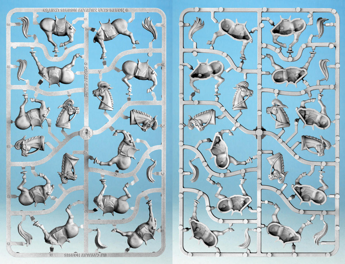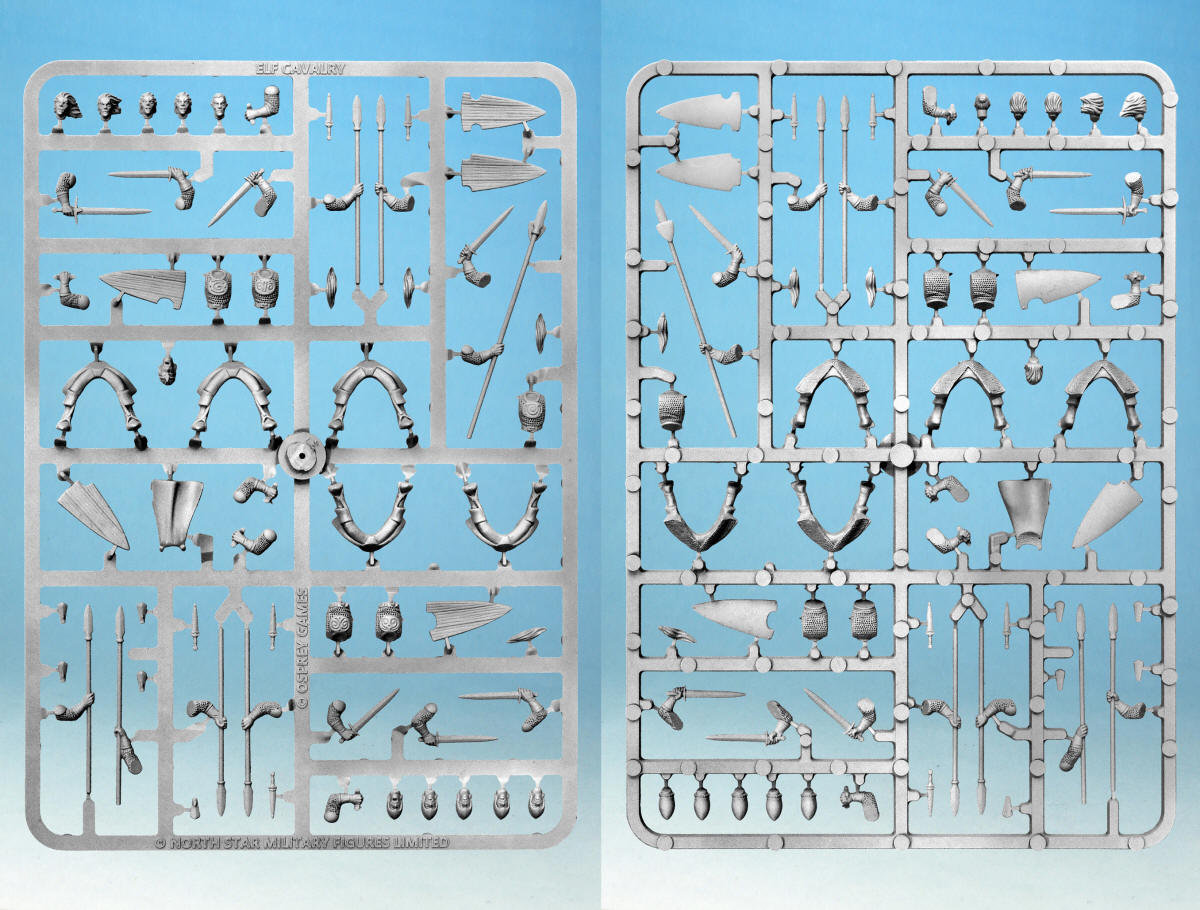 This box set contains enough parts for you to build 15 Elf Cavalry figures. We provide you with enough weapon options to make them all spearmen, all hand weapon and shield or any combination of the two. Each frame also contains a standard bearer and officer option. So you could have a giant unit of 15 Cavalry with an officer and standard bearer, or three units of 5 Cavalry with mixed weapons and a standard/officer each!