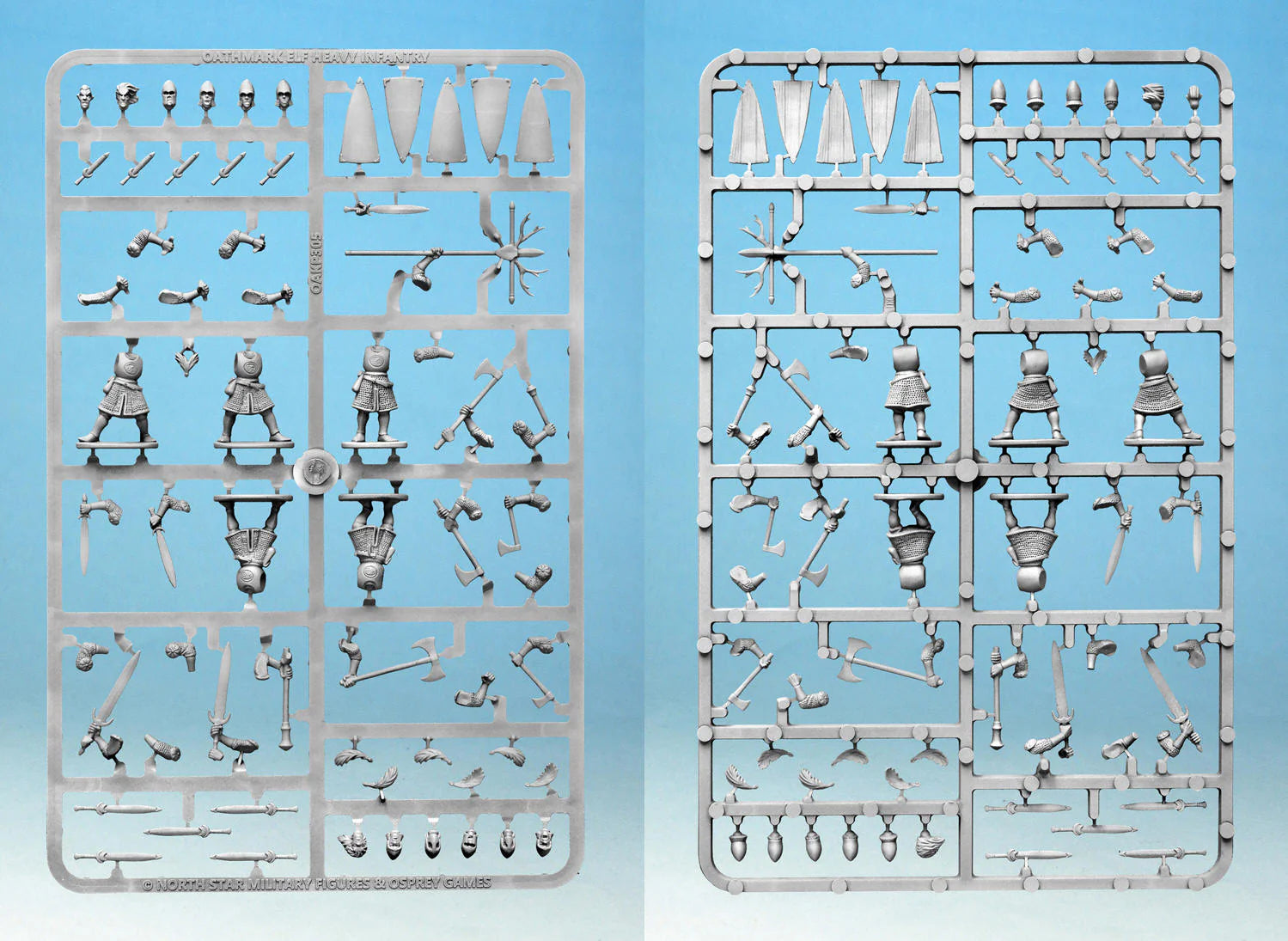 This boxed set contains enough parts for you to build 30 Elf Heavy Infantry. Provide are enough weapon options to make them all two-handed Weapons or all hand weapon and shield. These make either Warriors or Linebreakers from the Oathmark army lists. Each frame also contains a standard bearer and officer option; you could have a giant unit of 30 Elf Warriors with an officer and standard bearer, or six units of five Elves with an officer and standard bearer each!