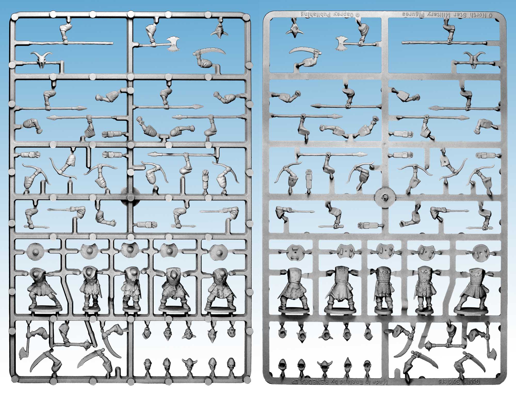 The figures are supplied unpainted and in kit form. You will need plastic cement to stick them together. The flag and shield designs are not supplied in the box. You can either create your own or buy the ones illustrated from North Star.