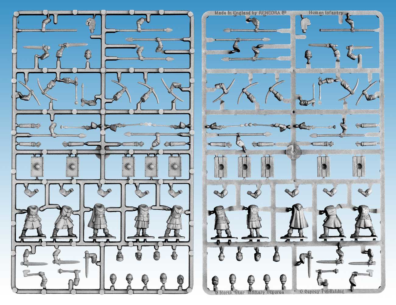 The figures are supplied unpainted and in kit form. You will need plastic cement to stick them together. The flag and shield designs are not supplied in the box. You can either create your own or buy the ones illustrated from North Star.