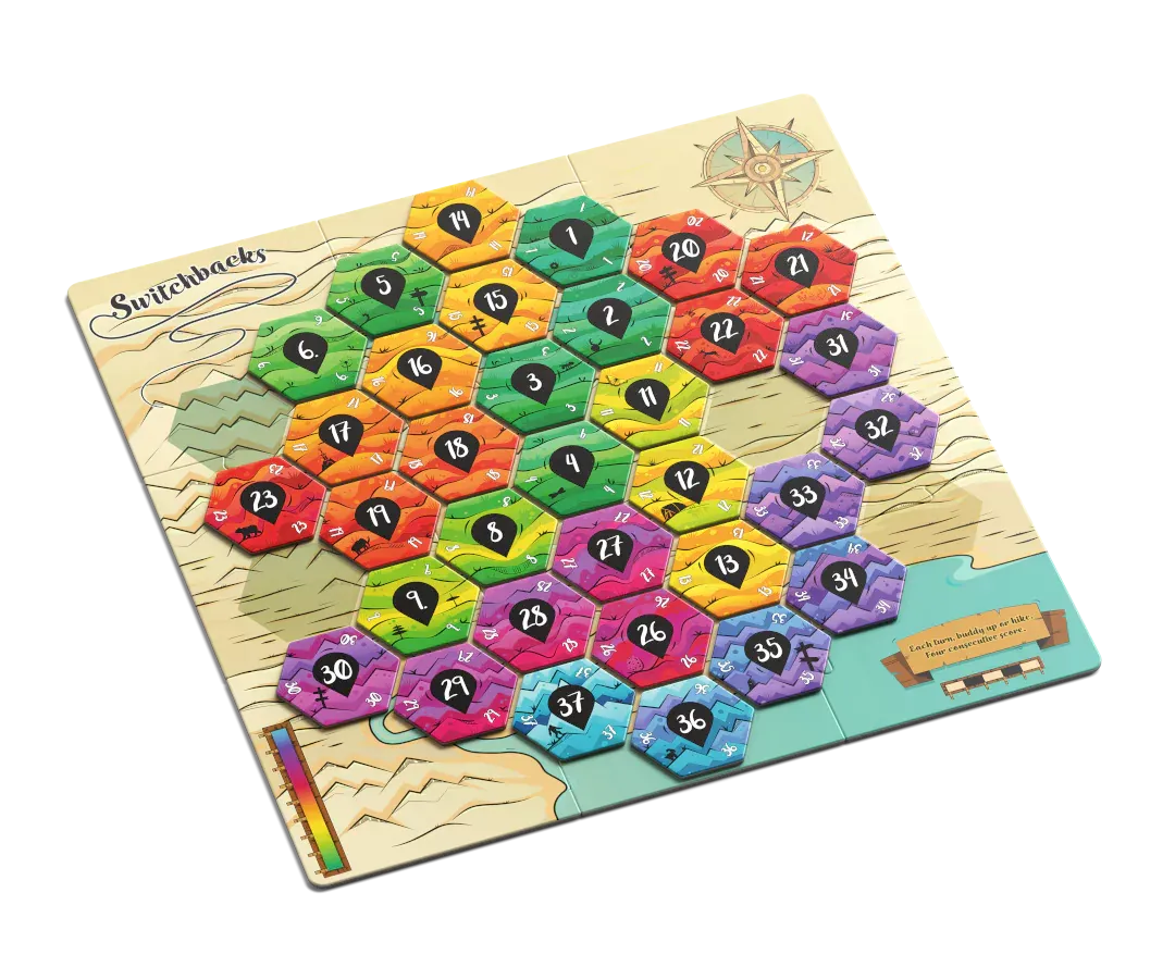 Hikers only score if they are on a path of 4 continuous numbers. Do you join an opponents’ trail to team up, or block their path with one of your own? Do you forgo a sure placement to buddy up your hikers for a perfect space next turn? Will that space even be available next turn?
